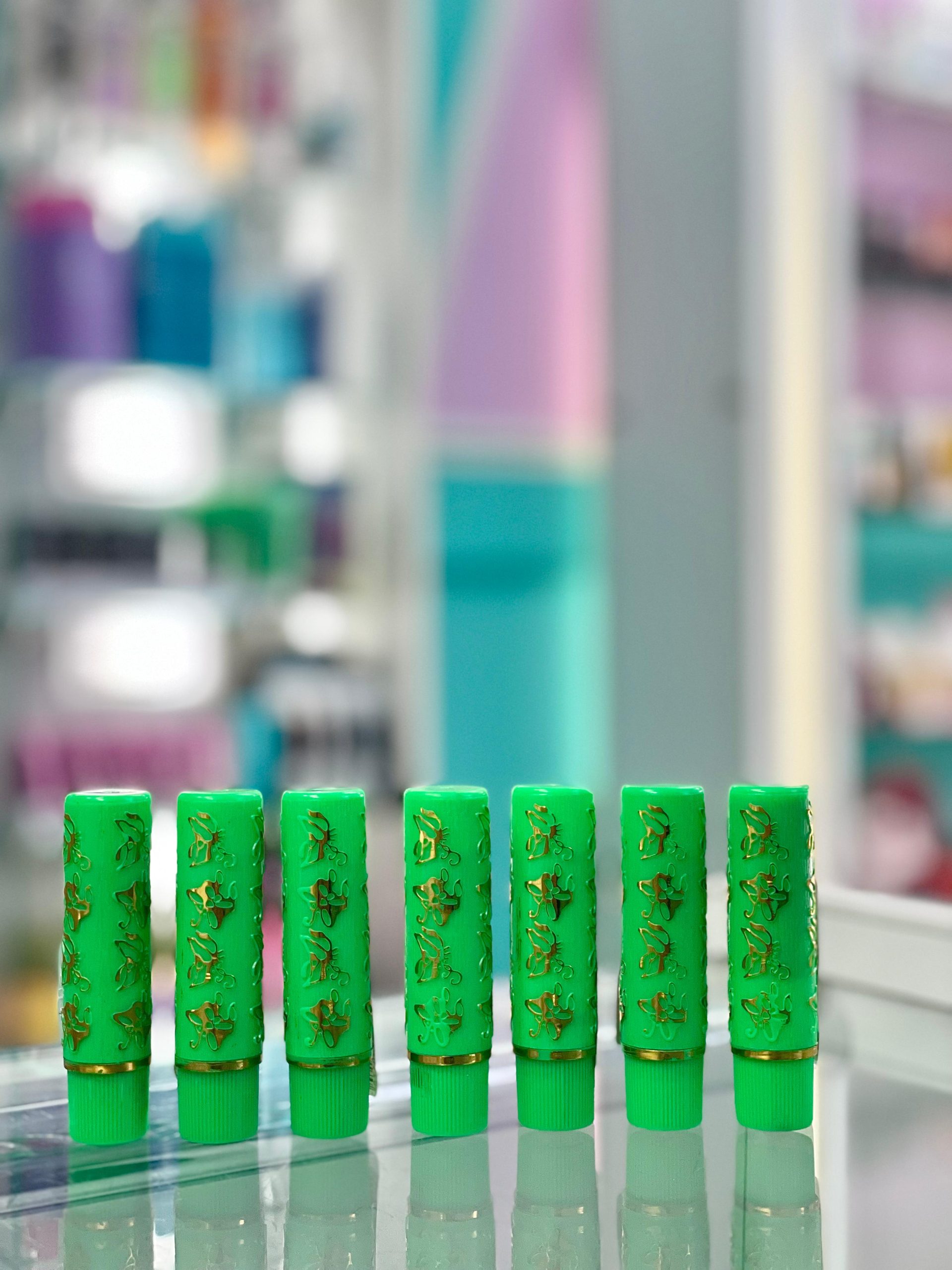 Embalagem verde com detalhes dourados, elegante e prática.