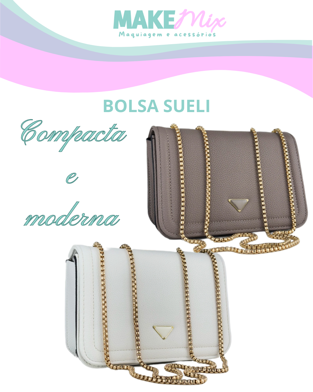 Possuí fecho em botão magnético, fechamento em zíper,compartimento para cartões e alça dupla em metal dourado.